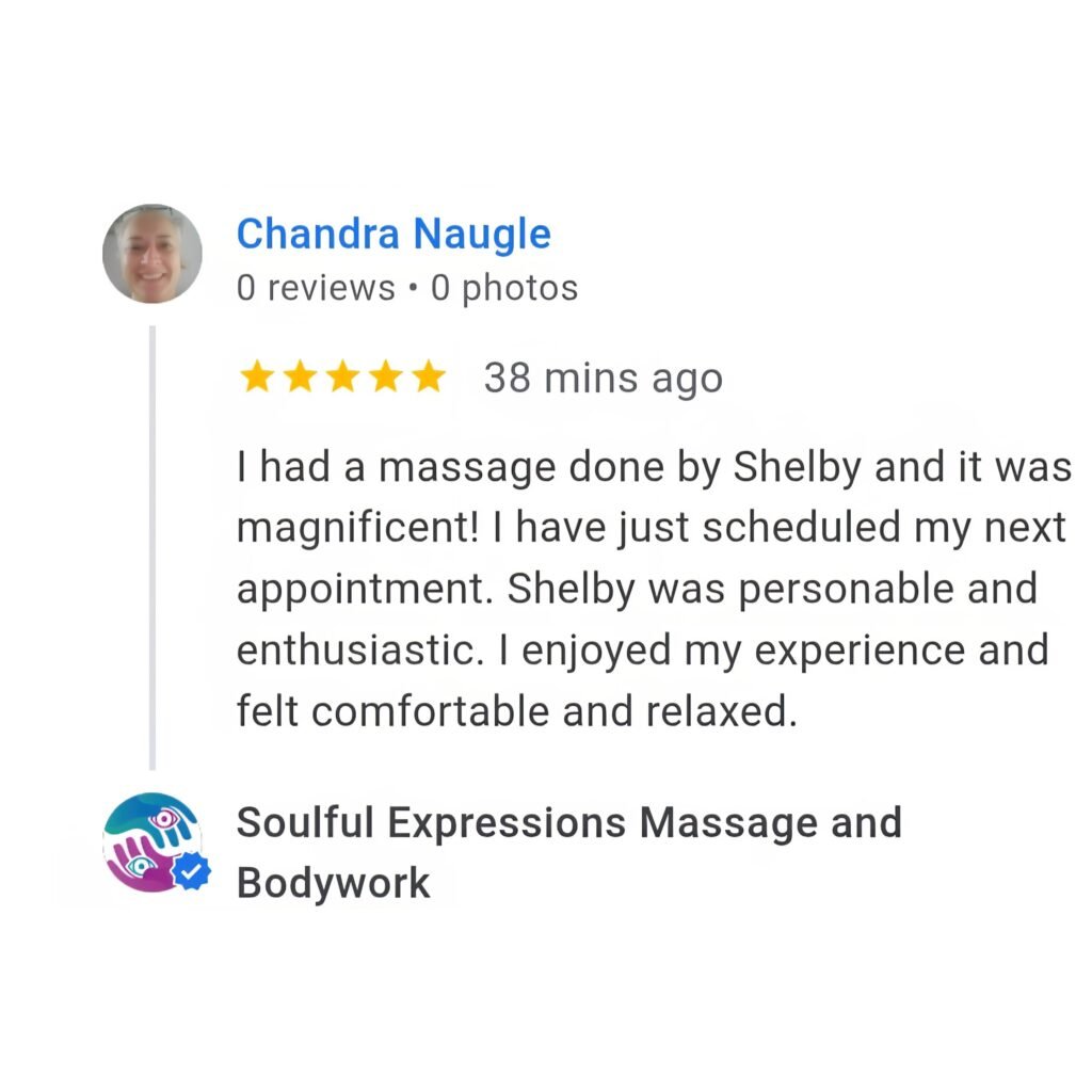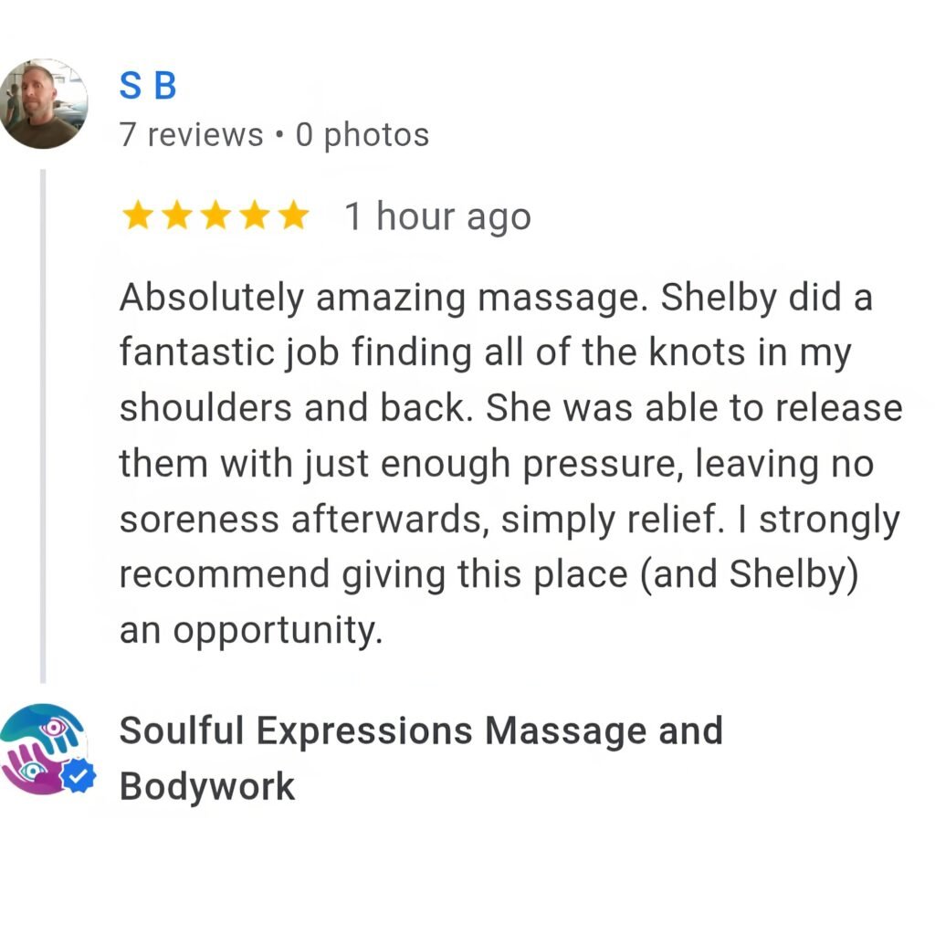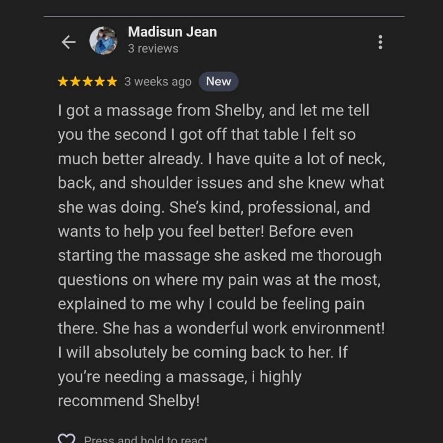 (You must show the review at checkout or at the beginning of your next massage to receive discount)